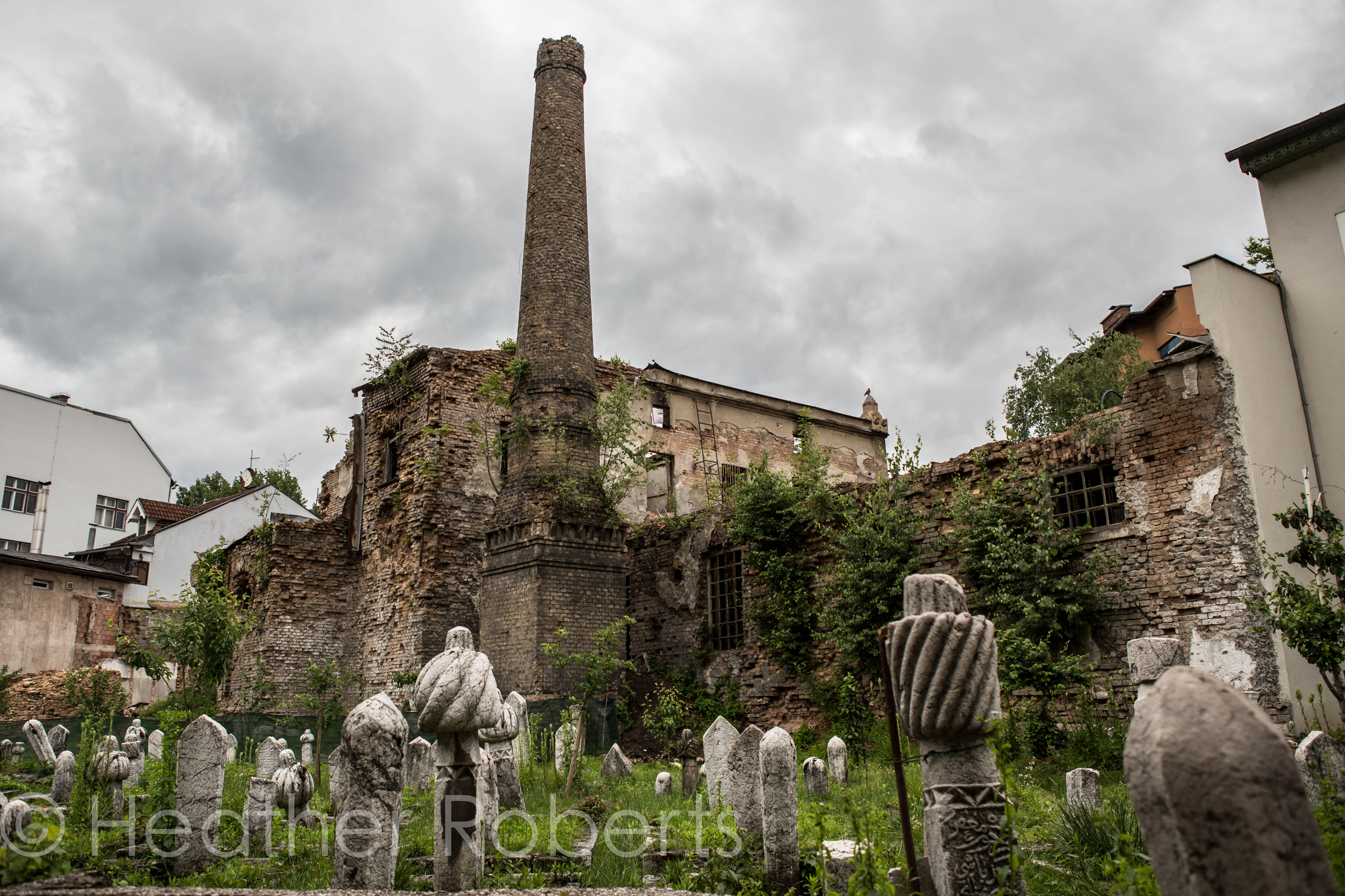 One of the first places we went to was the oldest mosque in Sarajevo. We didn’t actually go into the mosque itself, but we did walk around the grounds a bit. Part of living in Bosnia means you have to get used to seeing cemeteries everywhere. There are small ones around every mosque in the city. There are also cemeteries or small clusters of grave stones throughout the city, in the middle of parks, next to restaurants, and in back yards. This mosque had a very old cemetery on its grounds. I learned some important facts about how Muslims are buried (or at least Muslims in Sarajevo.) There are two grave markers for each deceased person. One is at the head, the other is at the feet. You can tell a man’s grave from a woman’s based on the adornment of the headstone. The men have a “turban” top on their stones. The women’s are much plainer. The body is also always pointed toward Mecca.