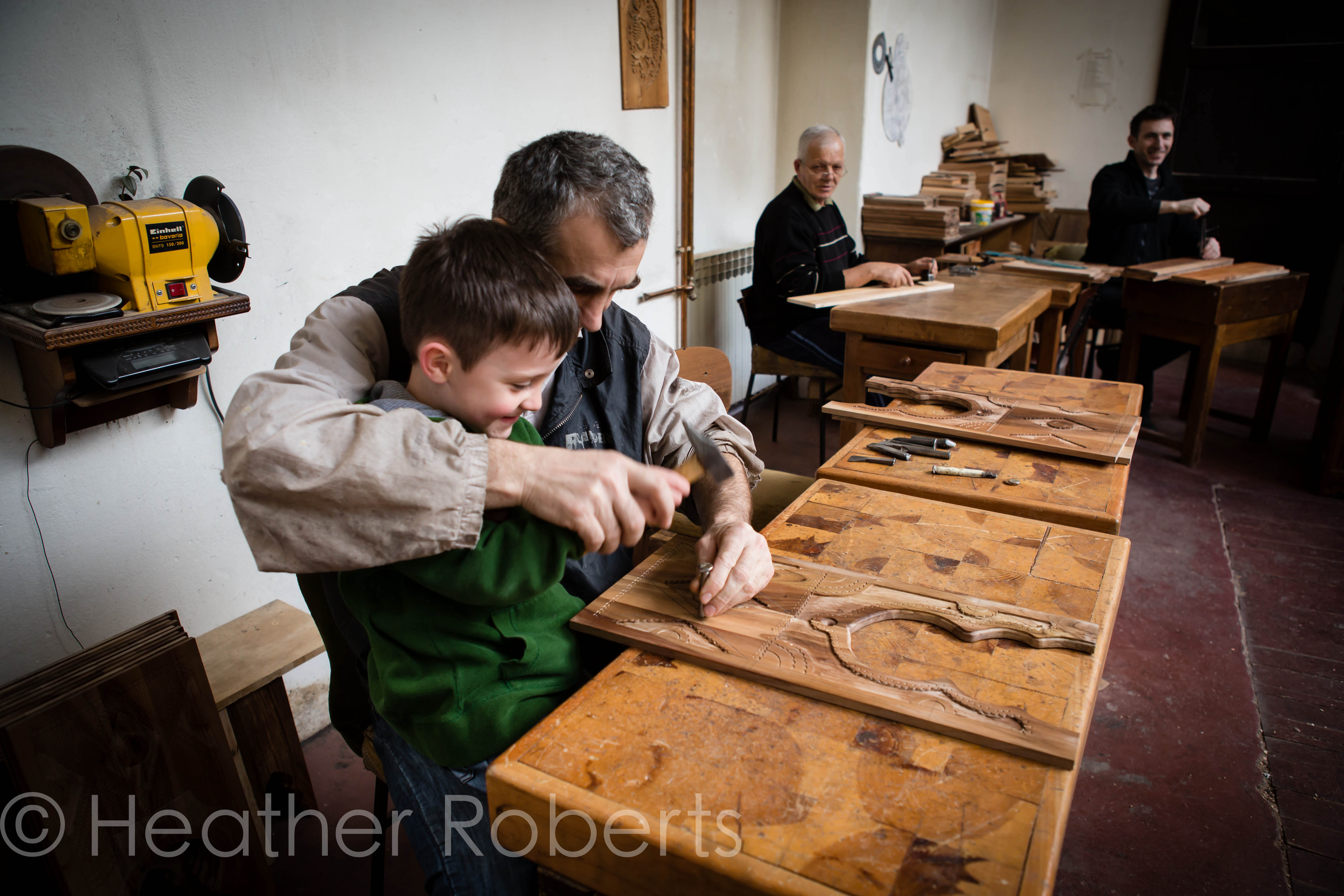 But, in order to truly torture our kids, we had to stop along the way! We had been told about an amazing furniture shop in a town called Konjic on the way to Mostar. Rukotvorine didn’t disappoint. Not only was the craftsmanship mind blowing, the man that was working the floor was about the coolest guy ever! His English was about as good as our Bosnian, so we definitely had to rely on our trusty sign language to get our point across. He did his best to show us around and explain how the furniture was made and what it all symbolized. The boys were interested for a solid 3.5 seconds, so we spent a lot of time reminding them to look with their eyes and not their hands! You’ll hear me say this a lot over the next couple of years, but one of my favorite things about Bosnians is their love of children. You might be thinking, ‘Oh, I love kids too.’ But you’d be wrong. You might love kids, but Bosnians LOVE kids! All kids. Big ones, little ones, babies. And it isn’t just the women who love them. The men are just as enamored with our little people as the women are. Oh, and even the kids love kids! You should see the attention Lyla gets when I am at either boys’ school. But I digress. So, this guy was no exception to the Kid-Love rule. He cooed at the baby (and held her by the end of the visit) and rustled the boys’ hair. And then, he did something that caught me by surprise. He offered to take us back to the room that the furniture is made in. Heck yeah, we want to go! So, we all walk back to this little, sawdust filled room to see about a half dozen men, some sitting, some standing, all creating works of art. Then, one of the men patted his leg and invited Wyatt to come sit on his lap as he whittled away on a piece of wood. And wouldn’t you know, my super shy guy went right over. Not only did he get to see these creations being made first hand, the gentleman let Wyatt do the work. Here is what it looked like.