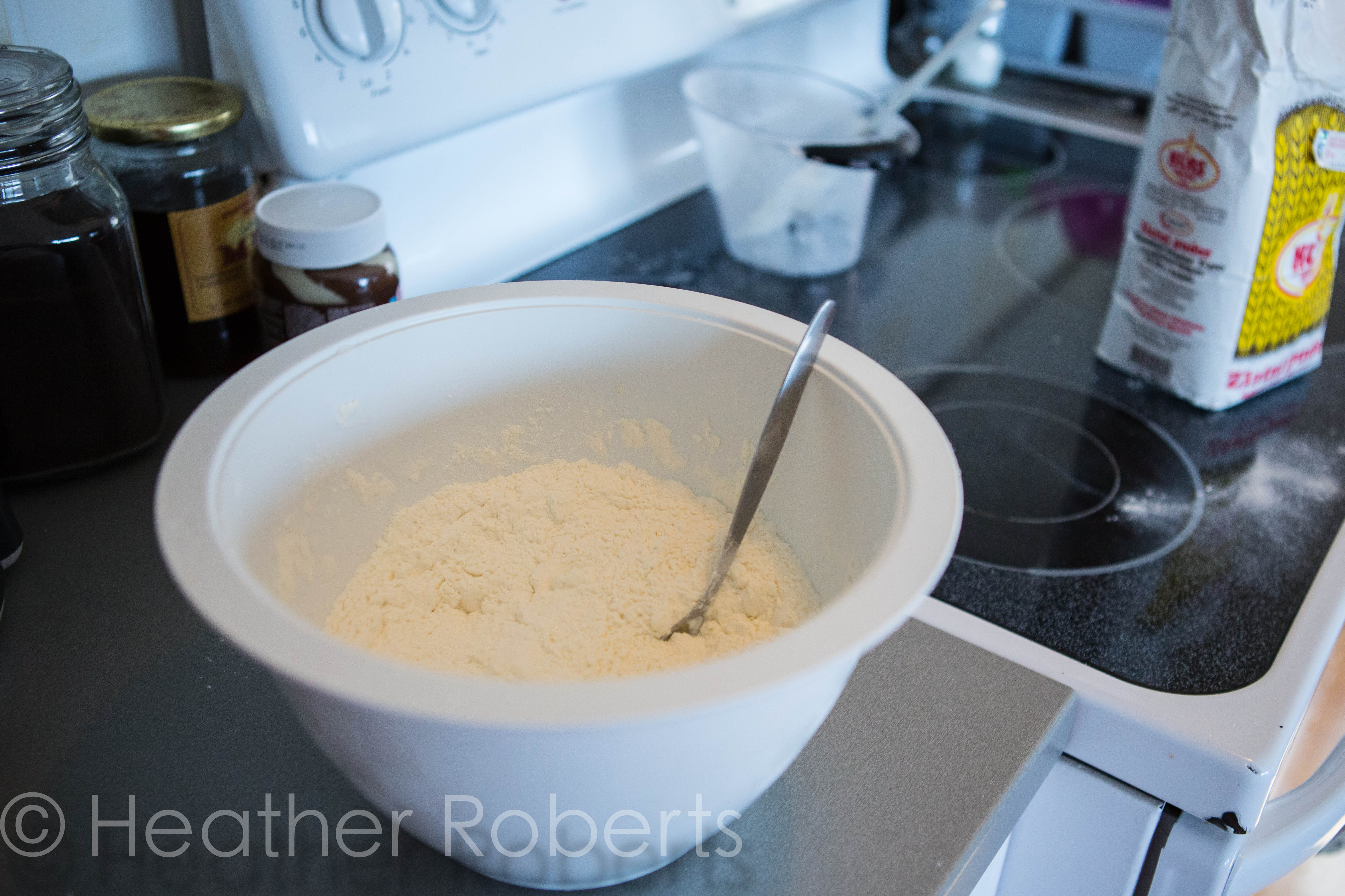 Now pay close attention, because this is a SUPER complicated recipe. First take 2 cups of flour and 1 tsp of salt and stir it together in a large bowl. Stay with me. Then, cut up 1/4 cup of shortening (Crisco) into the bowl. Am I losing you yet? In Jen’s recipe, she said you can use butter, but I say, why use butter when you can use lard? It’s a no-brainer. Keep in mind, we are still essentially living out of suitcases, and I don’t have my full kitchen yet, so I do everything the old fashioned way right now. If I had my kitchen, I would use my pastry blender to then cut the shortening into the flour and salt mixture. Since I don’t, I just use a fork. I have found that cutting the shortening in before you add the warm water makes for a more even mixture all together, when, as I said earlier, you are low-tech and have no mixer to do the work for you!