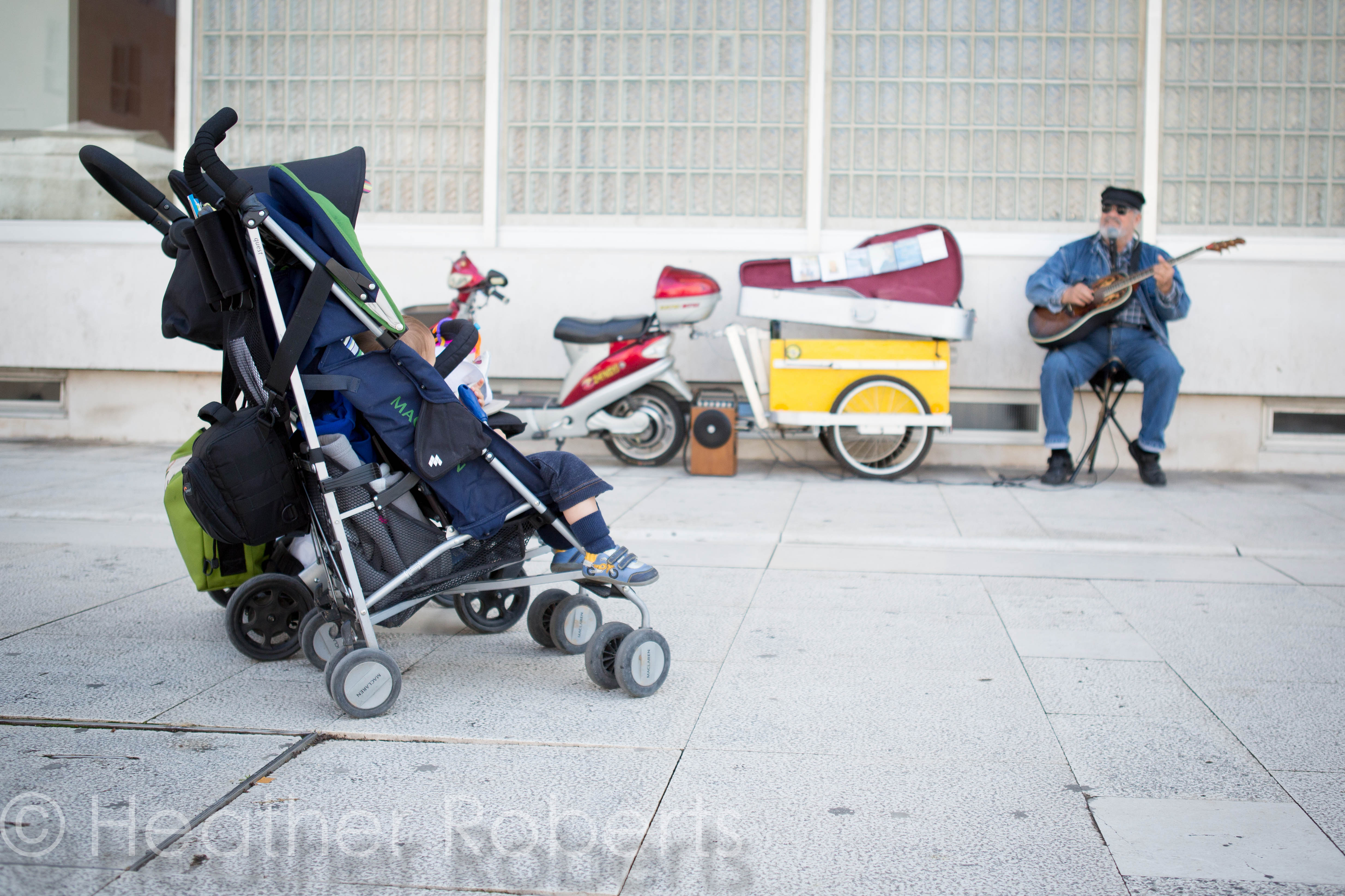When traveling with this many children, one of whom was violently ill the day before, we have learned that the only way to succeed with a smile is to divide and conquer! So, the dads took the big boys up to the top of an The Cathedral of Anastasia and Karen and I had the littles. While we waited we listened to the sweetest street performer and his scooter-drawn trailer! The babies loved it!